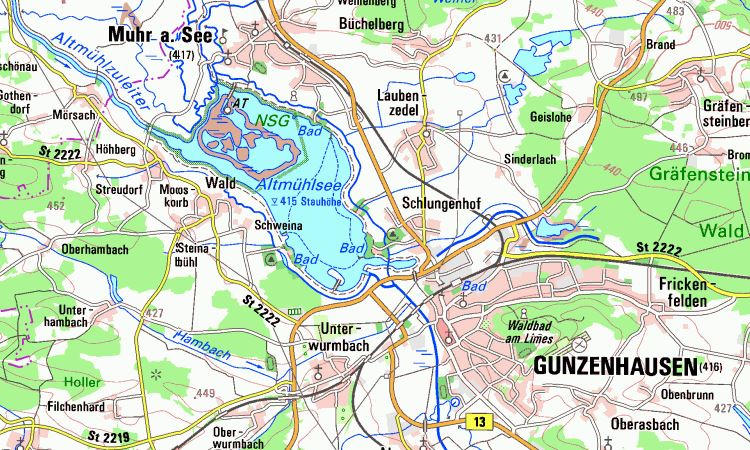 Stausee wird durch einen ca. 5 km langen Zuleiter ab dem Zusammenfluss von Wieseth und Altmühl bei Ornbau gespeist.